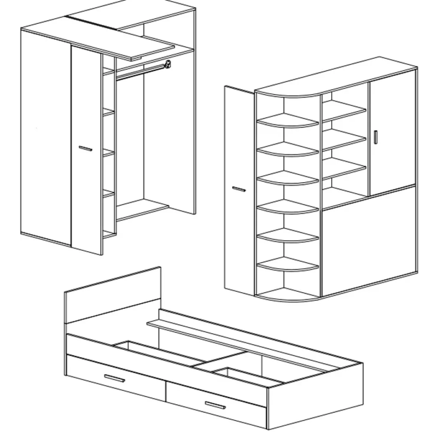 Fabio Gihome® è una cameretta composta da un letto singolo e una capiente cabina armadio, il tutto realizzato nella finitura bicolore fucsia e rovere. La cabina armadio è dotata nella parte esterna di una libreria ad angolo composta da 6 ripiani, a fianco una seconda libreria con 3 ripiani e infine un’anta battente dietro la quale si nascondono altri 3 ripiani, per ritirare tutto ciò che non deve essere lasciato a vista. L’interno della cabina armadio è invece organizzato con 3 ganci appendiabiti e 3 ripiani sulla parte di destra, mentre sull’altro lato è presente 1 tubo appendiabiti con 1 ripiano superiore e a lato una colonna con 4 ripiani. Il letto, in misura 90×200 cm, è fornito di due comodi cassettoni estraibili dotati di pratiche rotelle per facilitare l’estrazione e garantirti il massimo comfort. Saranno perfetti per tenere ordinati i giochi o per ritirare le coperte per il cambio di stagione! La composizione non è reversibile, ma il letto può eventualmente staccarsi dalla composizione e essere posizionato in un altro posto della stanza.