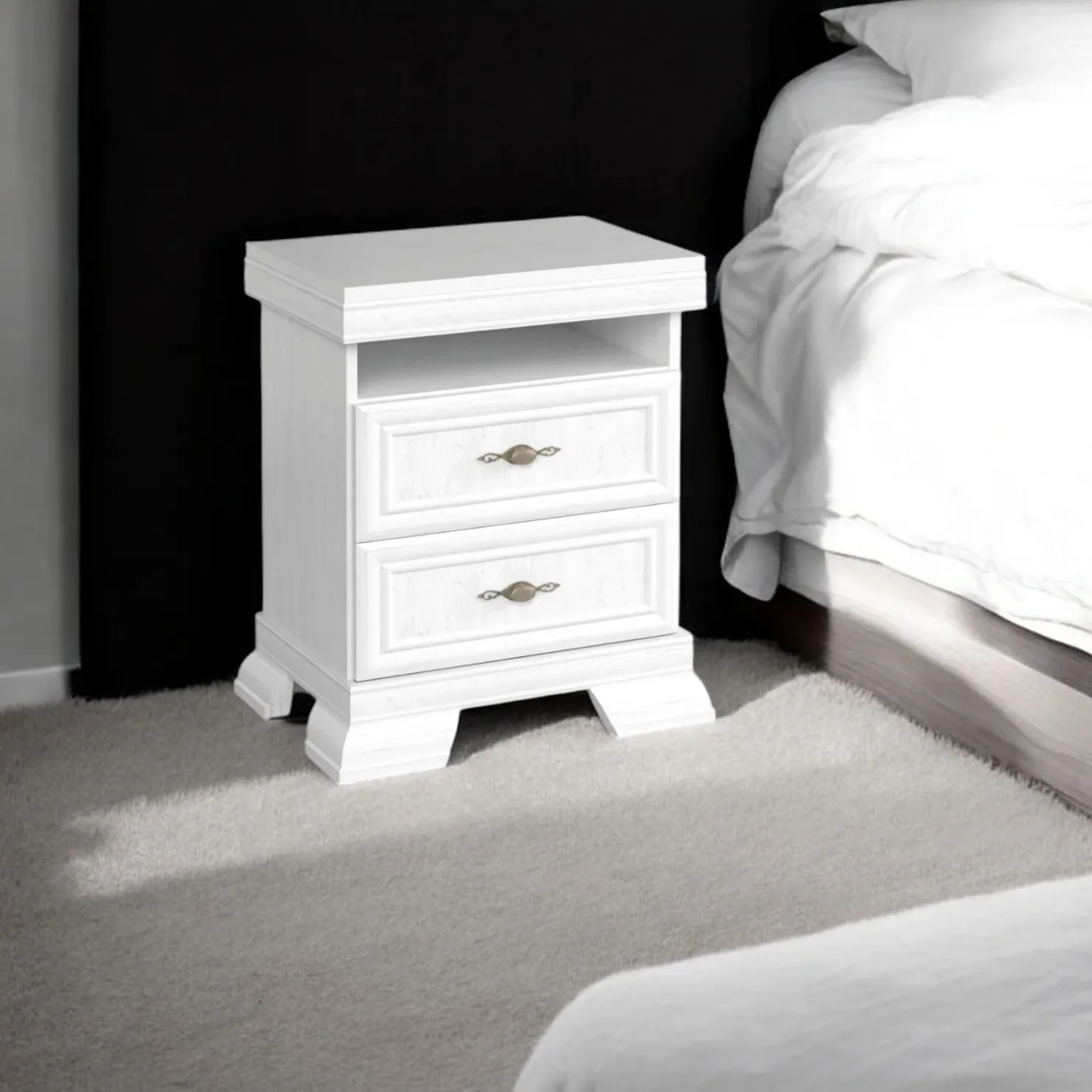 Comodino 58x68cm 2 cassetti bianco frassinato Kelly grazie alla sua finitura sembrerà che la tua zona notte sia più luminosa e spaziosa. Donerà alla tua camera eleganza e fascino.