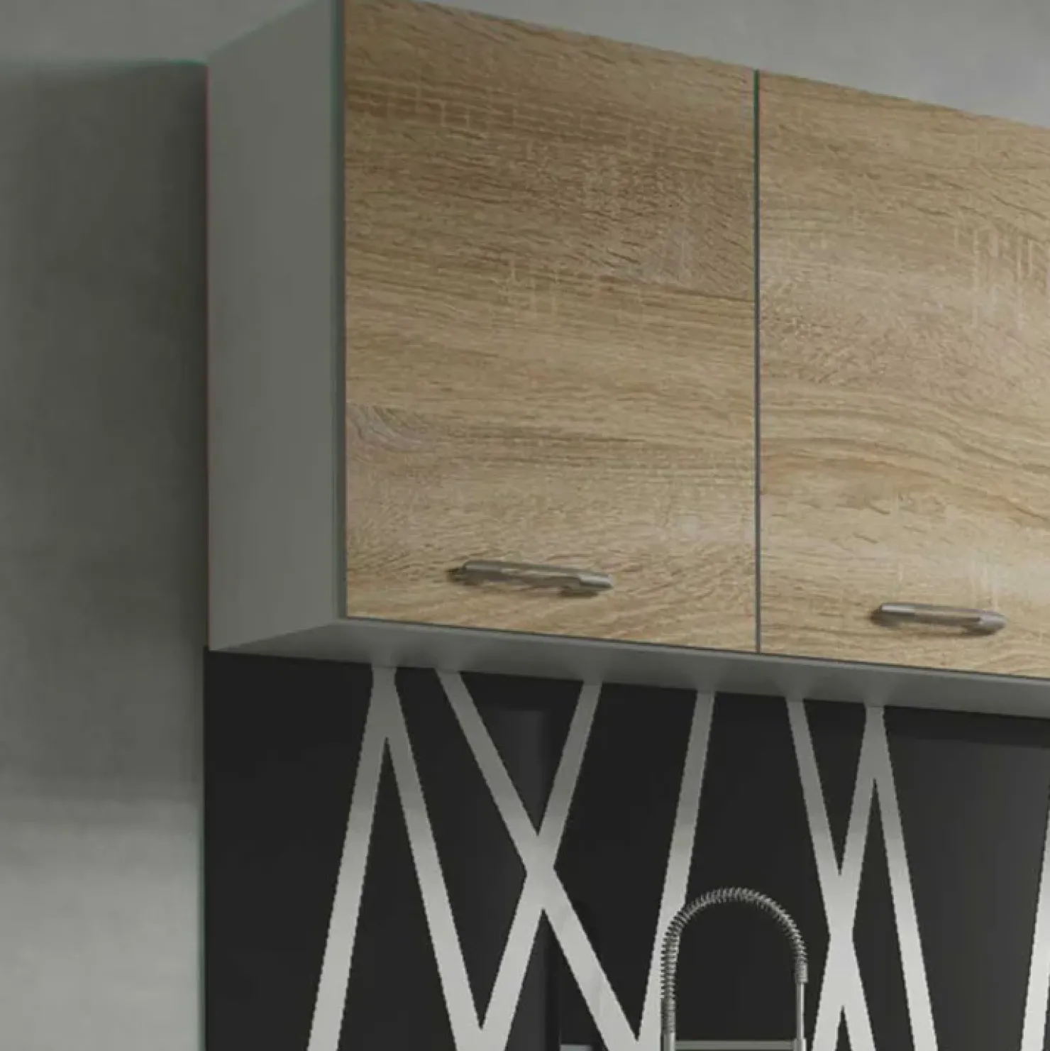 I frontali in finitura effetto rovere si combinano con la struttura e lo zoccolo nel colore bianco opaco. Pensata e progettata per garantire il massimo comfort, questa cucina combina design ad una corretta funzionalità. Grazie ai vari accessori di cui è composta, è perfetta per organizzare al meglio ogni spazio.