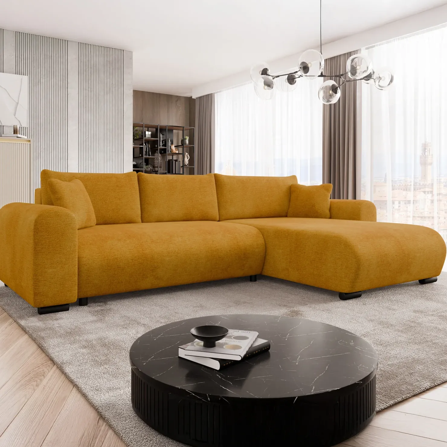 Divano letto angolare 4 posti 285x188cm con contenitore imbottito tessuto giallo senape Soft