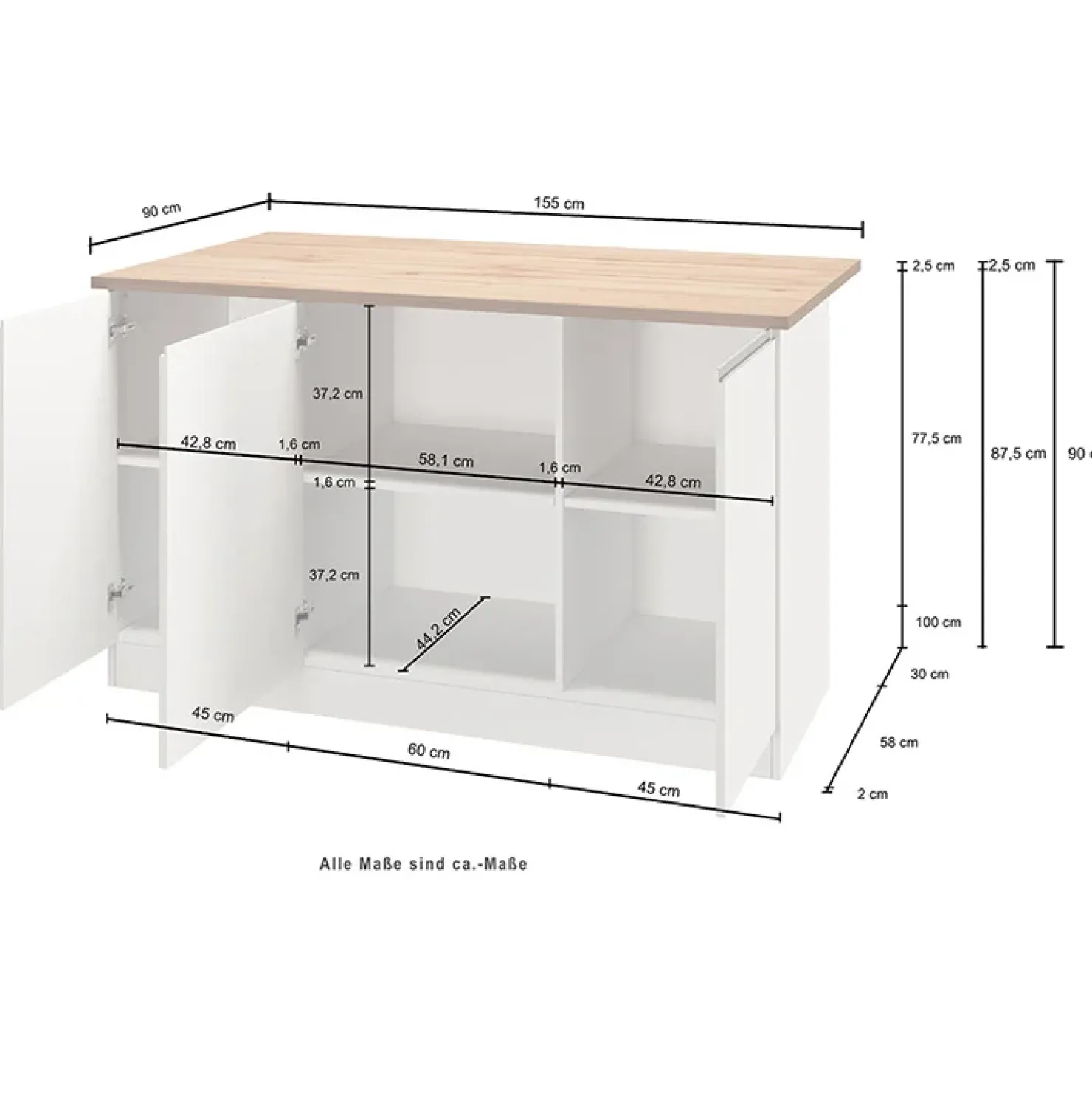 L’isola da cucina Gourmet con dimensioni di 155×90 cm è un capolavoro di design e funzionalità, progettato per diventare il centro nevralgico di ogni cucina. Questa versatile penisola può essere utilizzata come tavolo da pranzo e dispensa, offrendo una superficie spaziosa per soddisfare ogni esigenza culinaria.