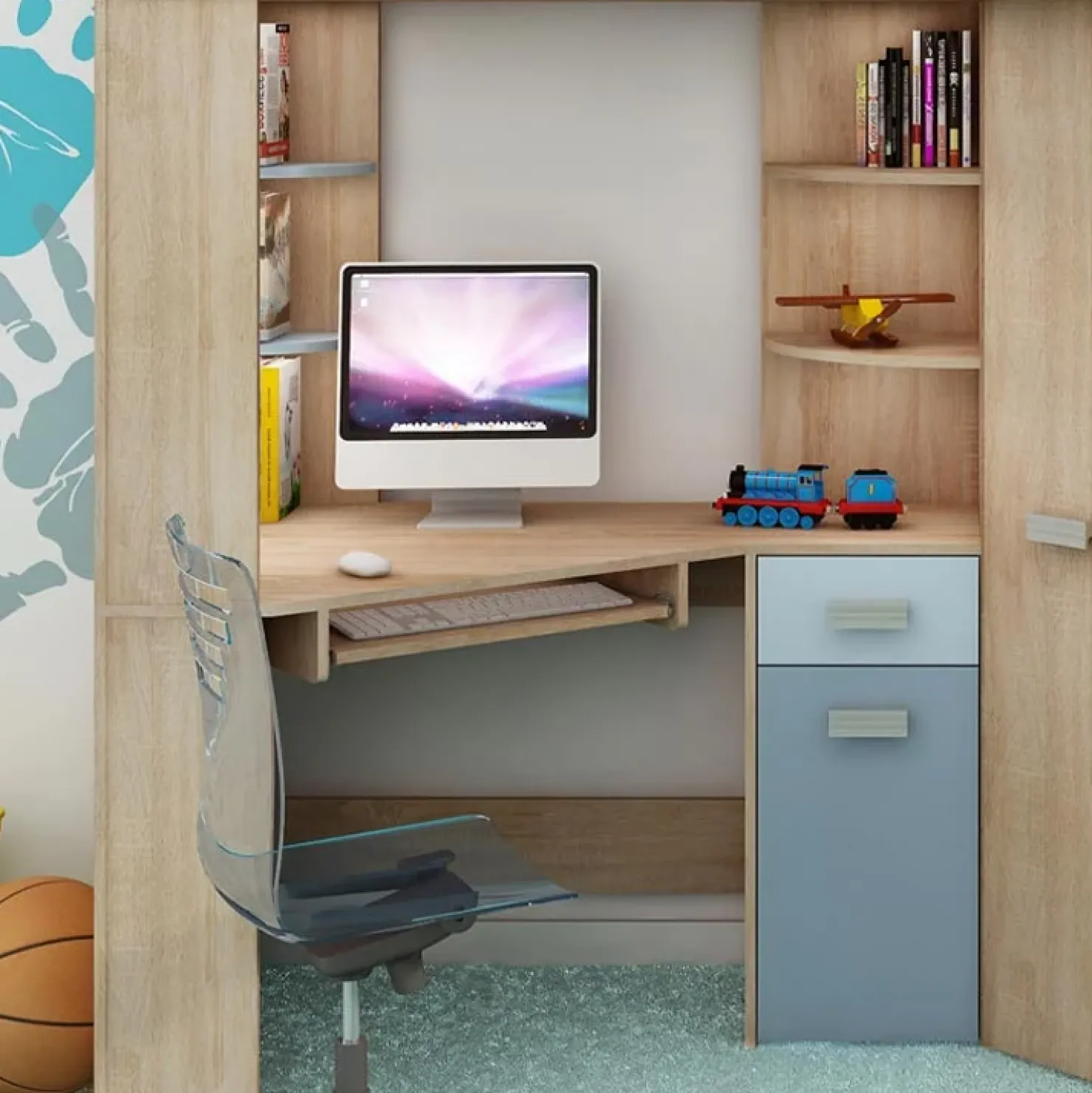 Offre un letto a soppalco raggiungibile da una scaletta con cassettone al fondo per contenere tutti i giocattoli. La parte inferiore, grazie alla sua pratica configurazione, può essere utilizzata come angolo studio e compiti. Inoltre dispone di un armadio a due ante per riporre indumenti vari, ripiano salvaspazio per la tastiera del tuo pc, mensole e cassetti per oggetti di cancelleria e libri. Funzionale ed elegante grazie alle linee semplici e finiture tenui, conquisterà i tuoi bambini e ragazzi che non avranno più scuse per mantenere in ordine la loro cameretta!