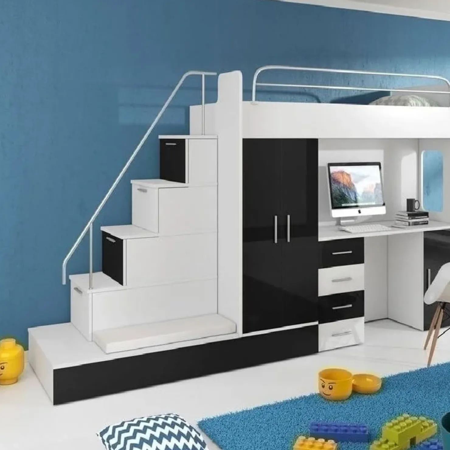 Letto a soppalco con armadio 324x180cm bianco nero 2 letti Diego Gihome® è una proposta decisamente funzionale e spaziosa, dotata di due letti, armadio e scrivania con anta e cassetti.