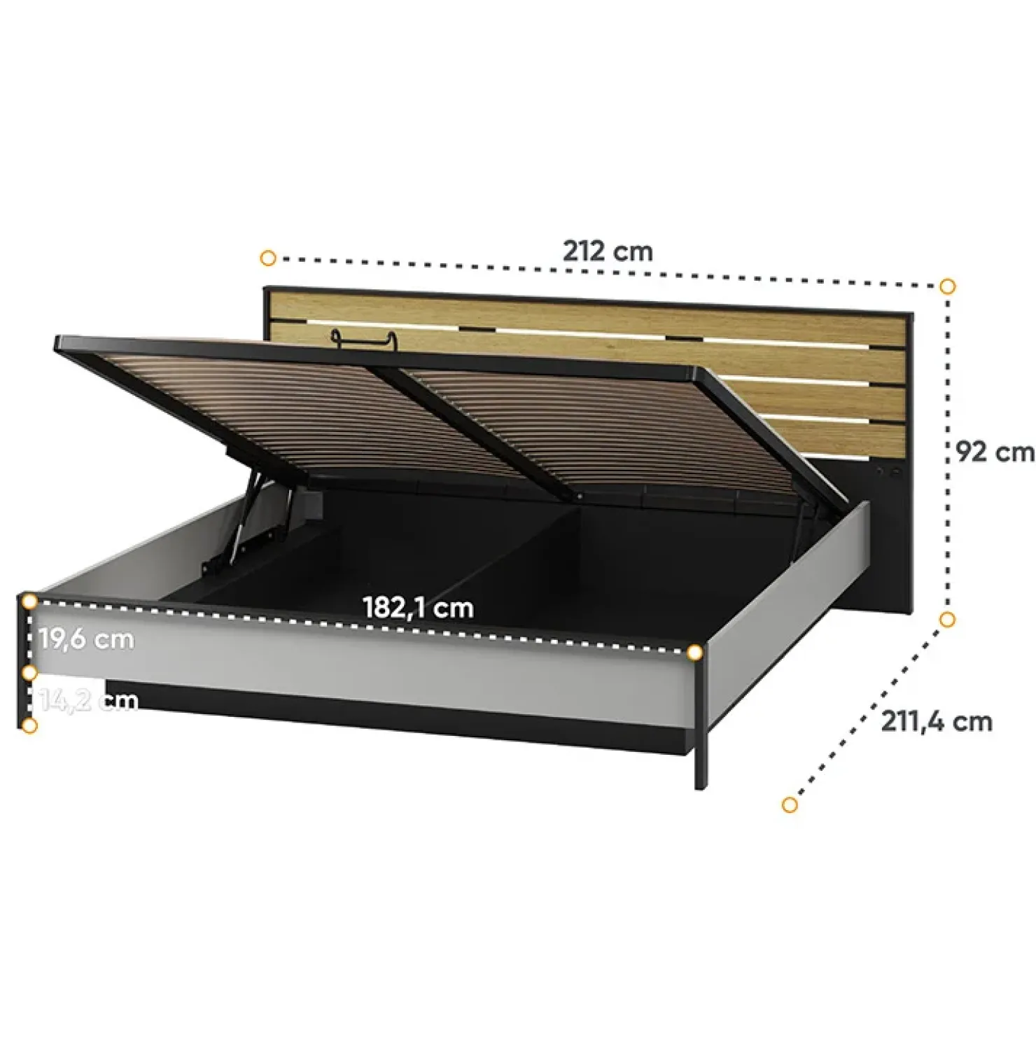 Il letto oversize è progettato per offrire un comfort eccezionale e una funzionalità avanzata, rendendolo la scelta ideale per chi cerca il massimo rilassamento nella propria camera da letto. Con dimensioni generose di 211 cm di lunghezza, 212 cm di larghezza e 92 cm di altezza, questo letto è stato progettato per accogliere un materasso largo 180 cm, garantendo un supporto adeguato e una posizione stabile grazie al resistente telai a sgoma.