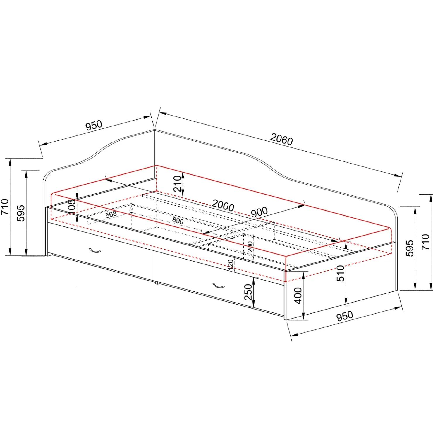- rete e materasso (non inclusi): 90 x 200 cm