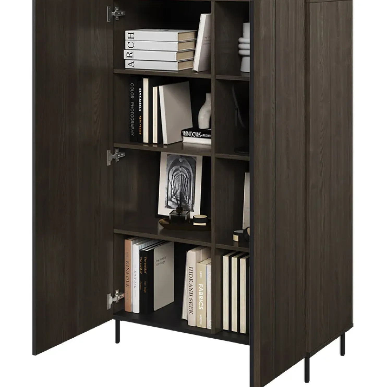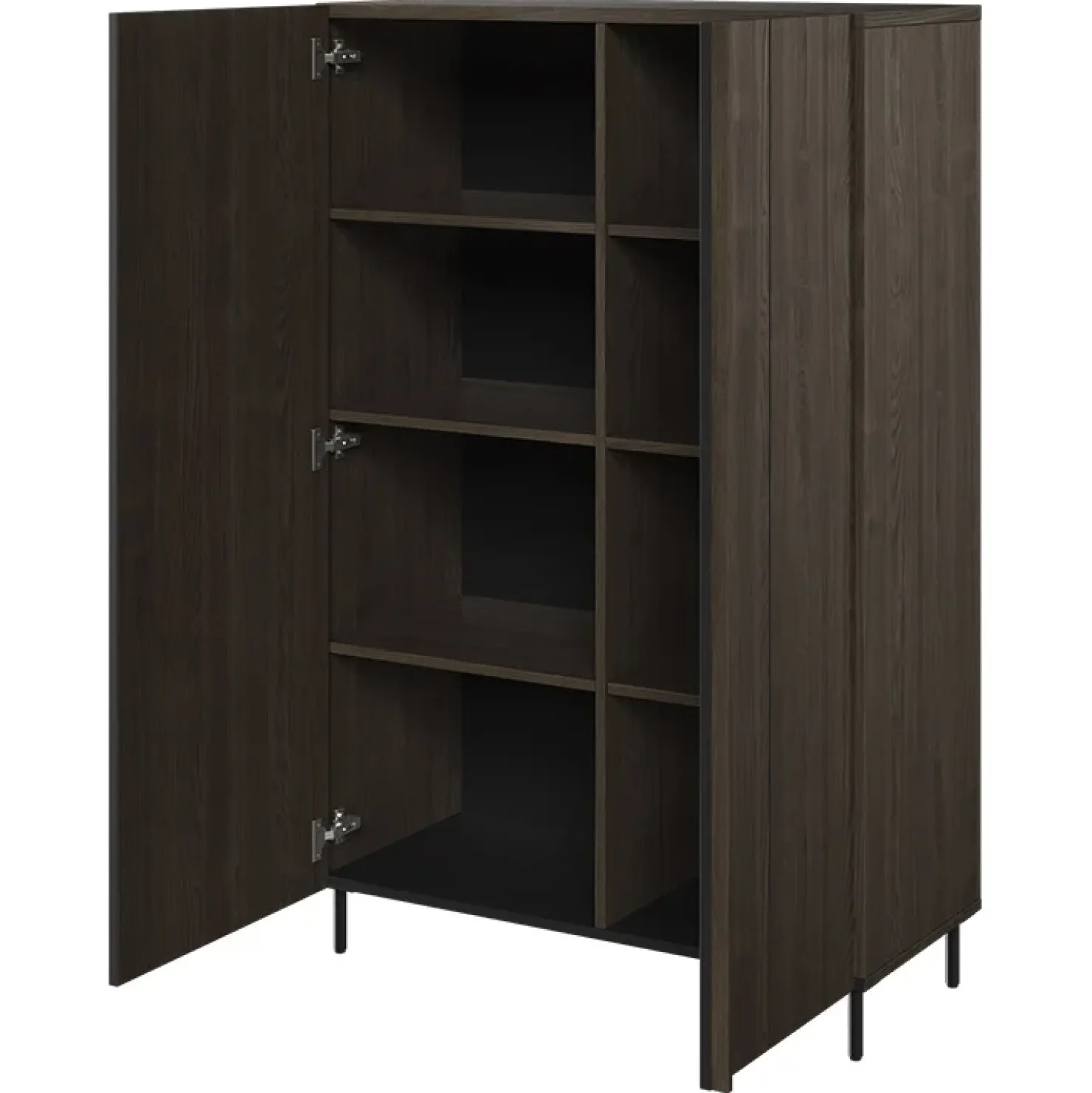 Dispone di 8 ripiani e 2 porte. Il carico consentito sullo scaffale è di 5 kg. Le cerniere sono in scatola e le maniglie sono strisce in MDF. Le gambe sono in metallo.
