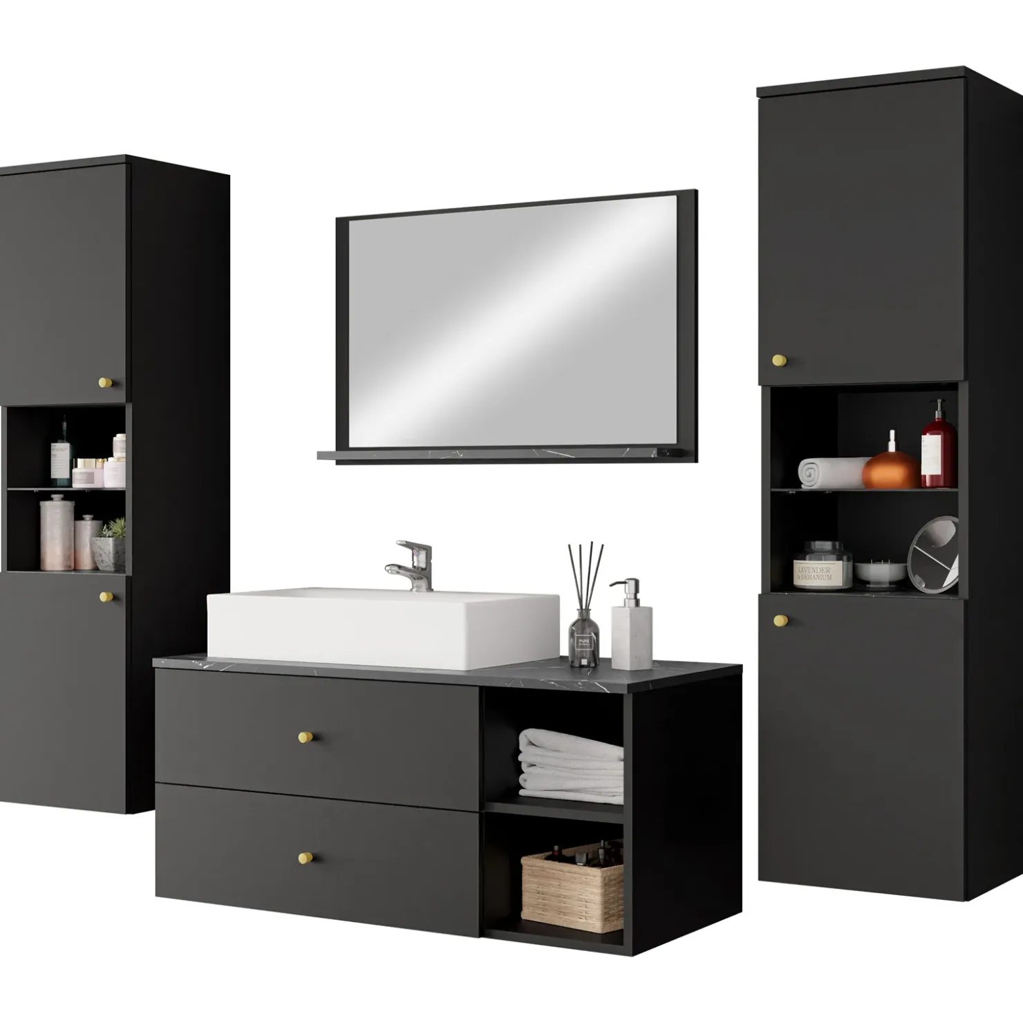 Ogni elemento è progettato per ottimizzare lo spazio: cassetti capienti, vani aperti e ripiani pratici ti permettono di organizzare ogni accessorio in modo ordinato.