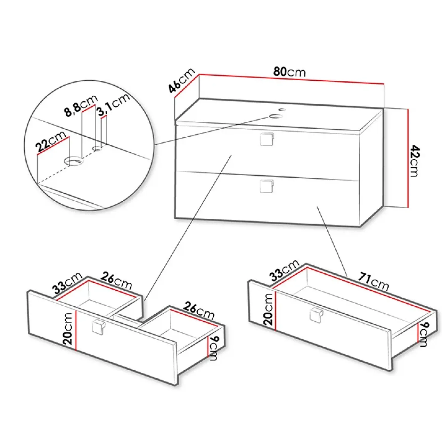 - dimensioni mobile: L80 cm X H42 cm X P46 cm