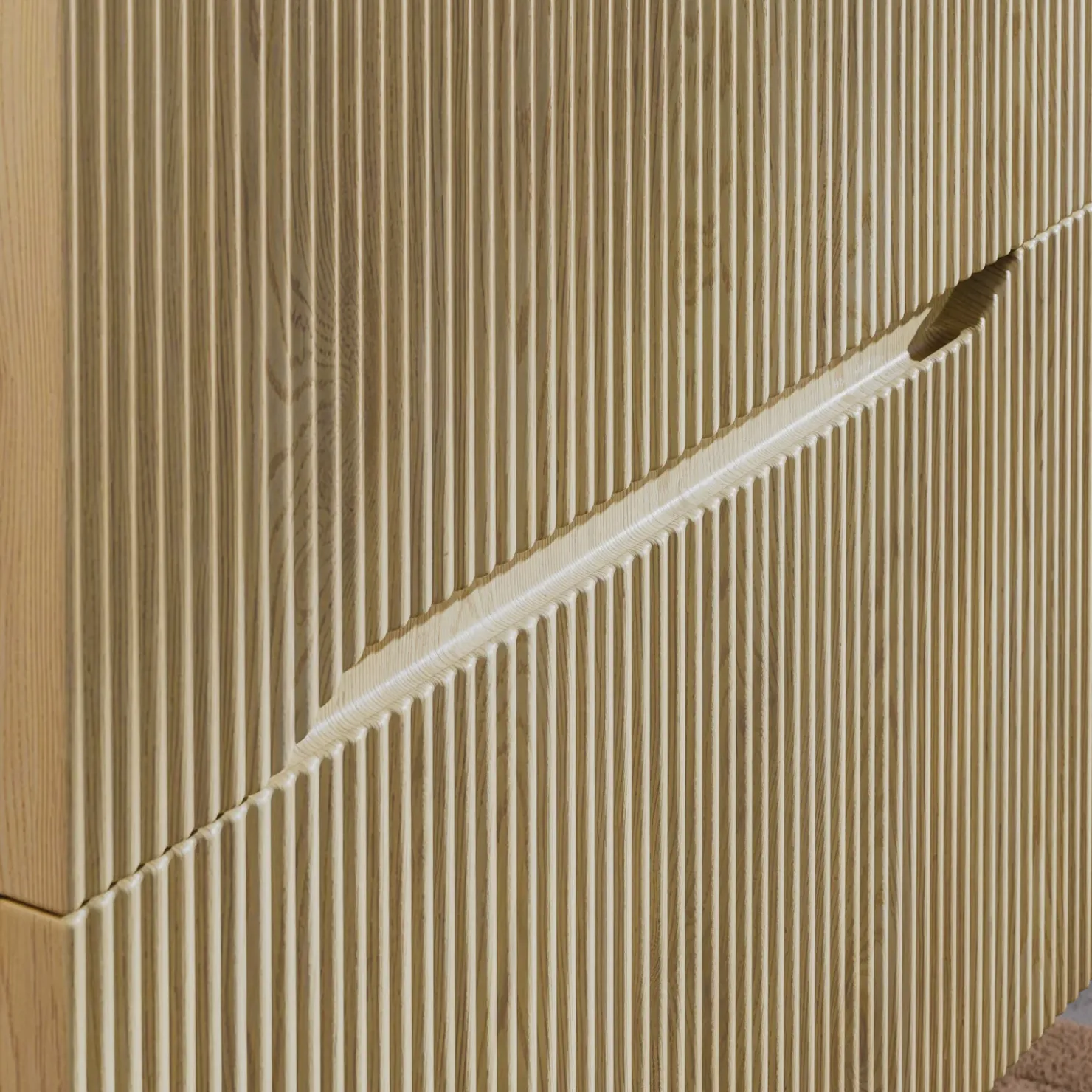 La struttura sospesa dona ariosità e modernità all’ambiente, facilitando la pulizia e valorizzando il gioco di luci e ombre creato dalle scanalature in legno. Le linee sottili e il profilo minimale si combinano con la matericità calda del rovere per creare un equilibrio perfetto tra estetica e funzionalità.