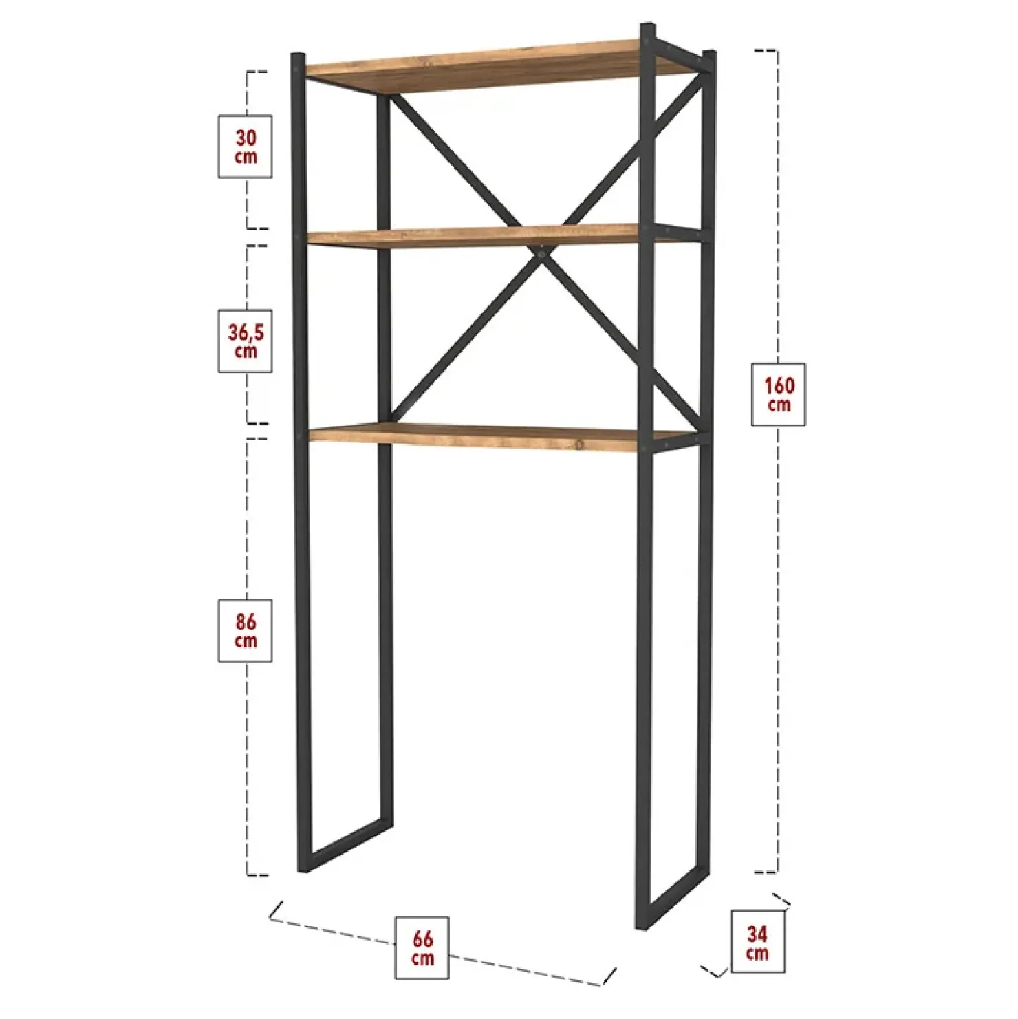 - distanza tra i ripiani partendo dall’alto verso il basso: 30/36,5/86 cm