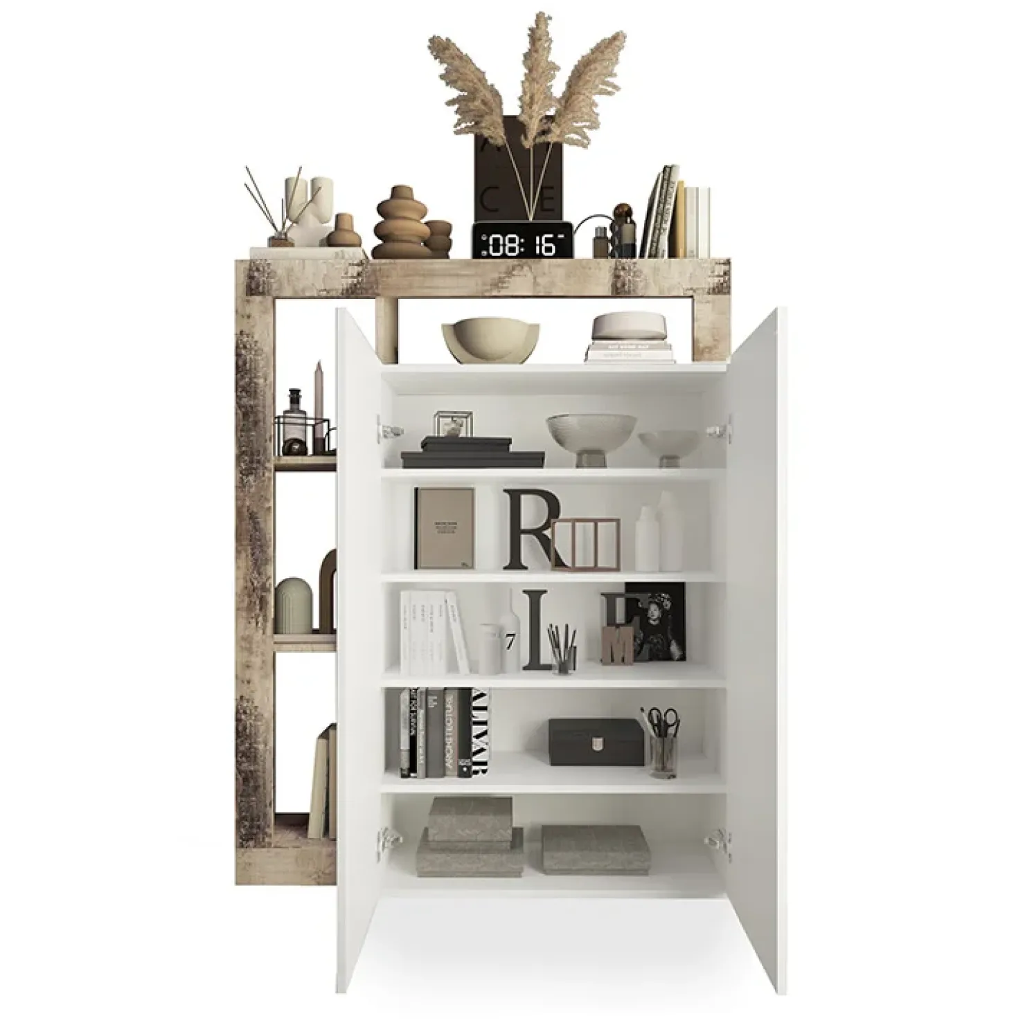 Questa scarpiera presenta ben 5 ripiani nascosti da due ante battenti e 4 vani a giorno da poter decorare ed abbellire come più ti piace.