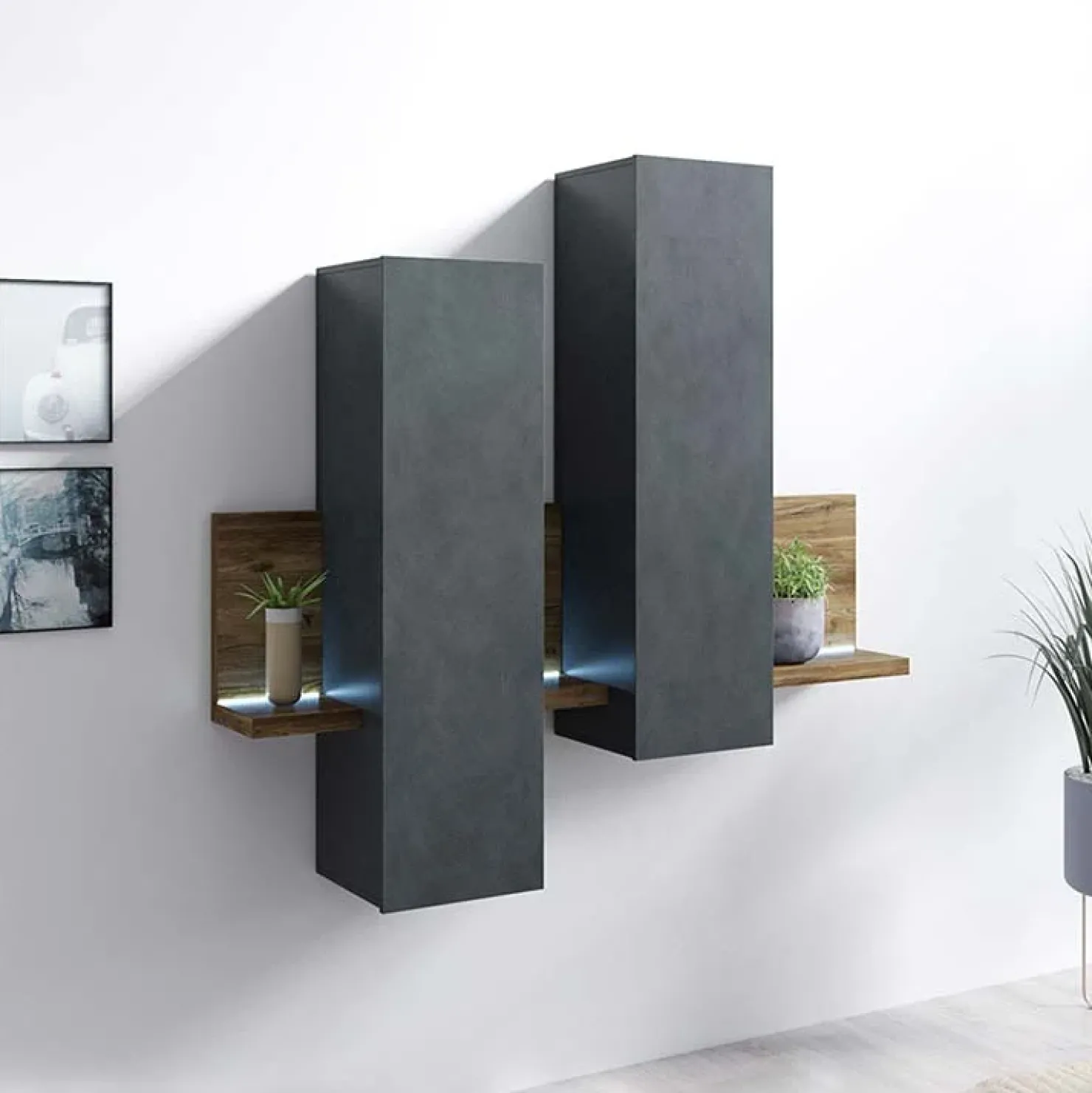 Pensile per parete attrezzata Megan Gihome ® antracite spatolato noce, caratterizzato dal design moderno, dona un tocco originalità al tuo soggiorno!