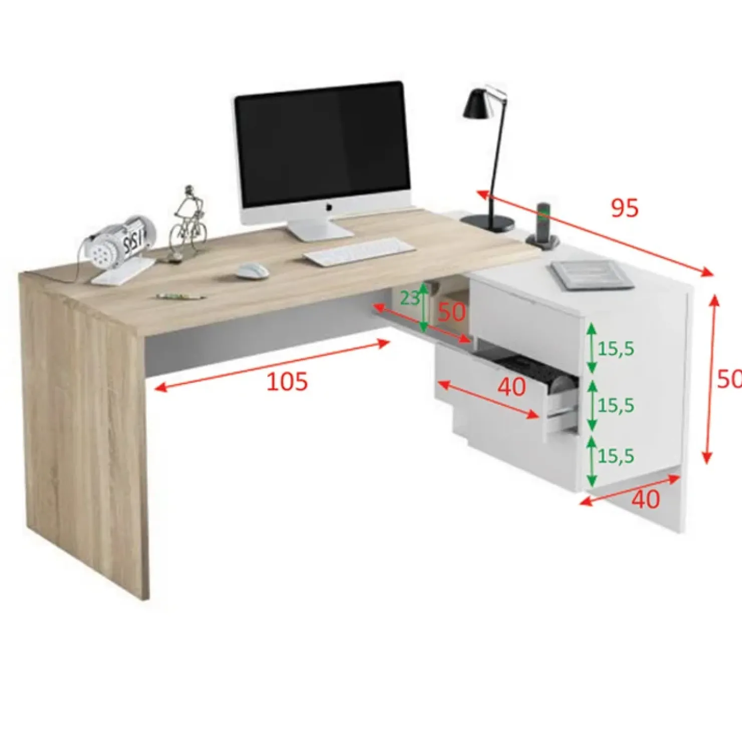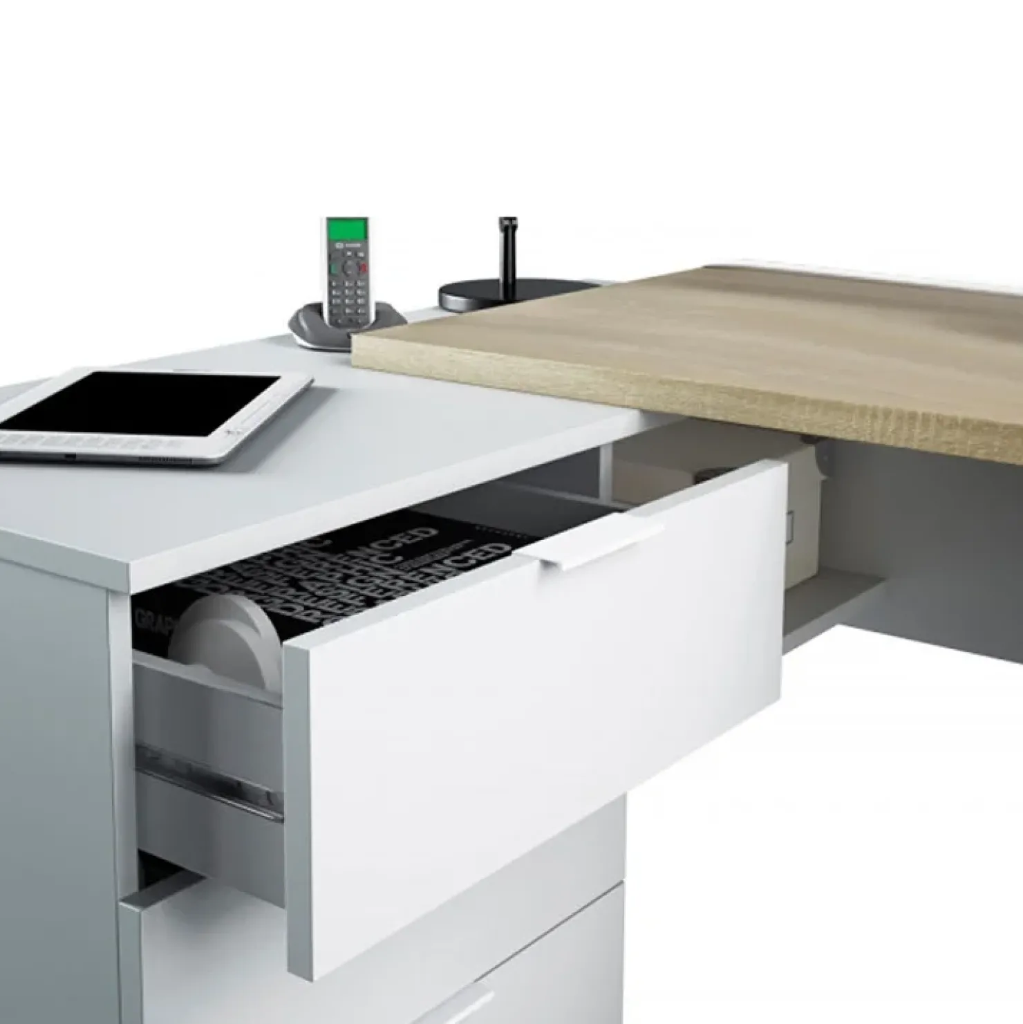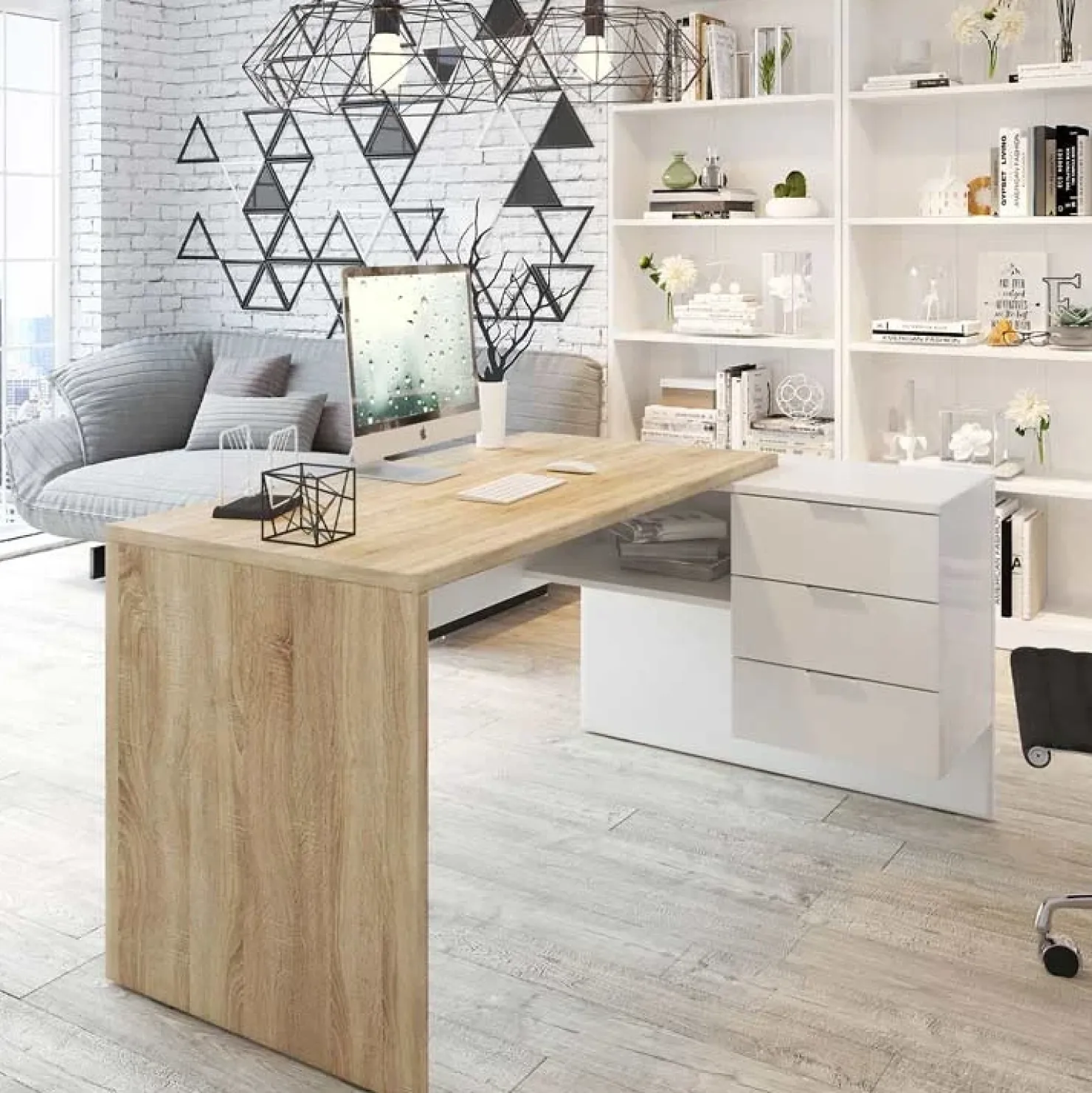 Realizzata nella finitura rovere natura e bianco opaco, Work è dotata di tre comodi cassetti e un vano a giorno sotto il piano, perfetti per tenere tutto sempre a portata di mano. Si tratta di una soluzione estremamente versatile: è infatti reversibile e potrai scegliere da che parte montare la cassettiera, in base alle tue esigenze.