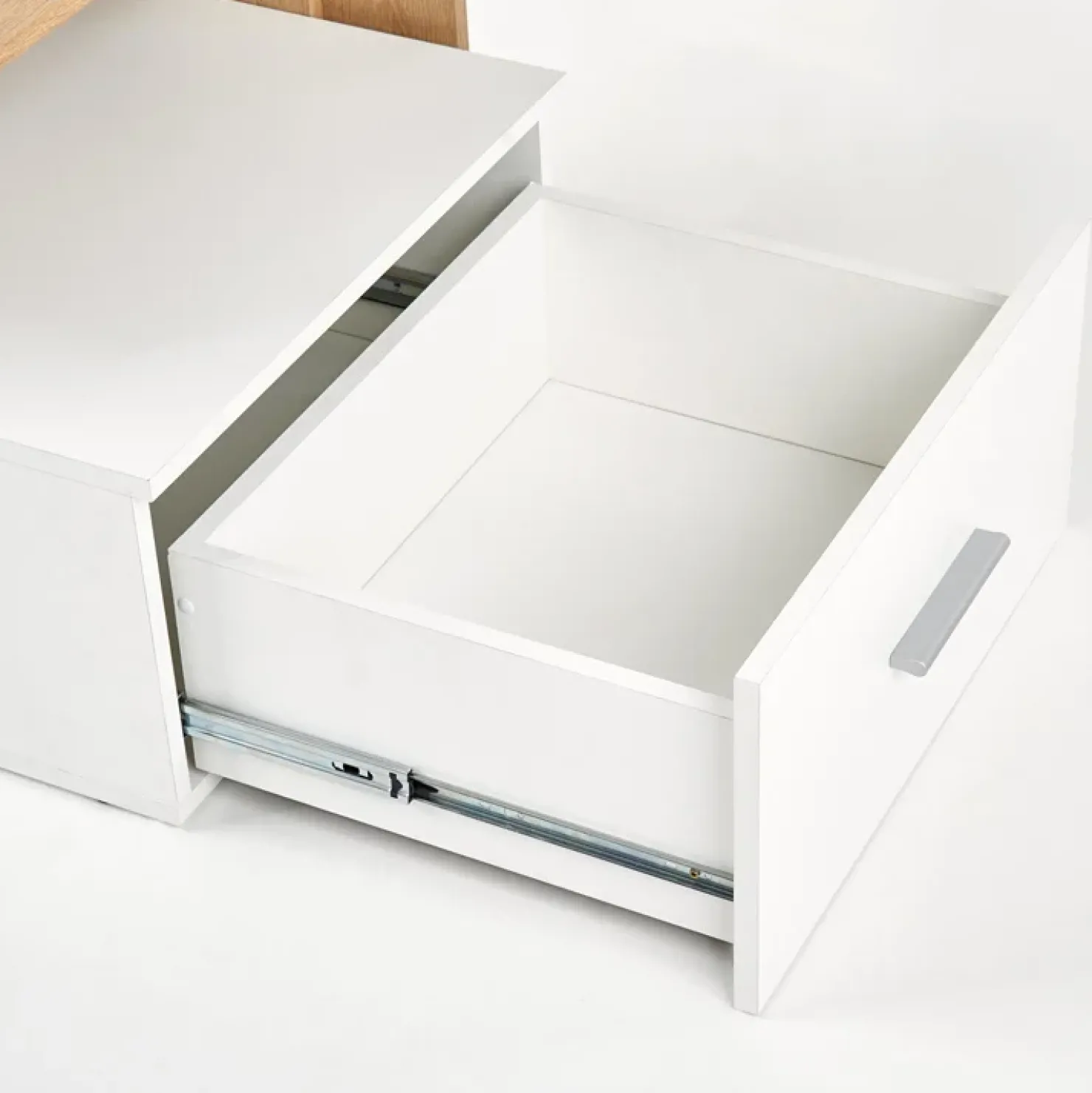 Jade Gihome® è formata da un piano bianco che va ad incastrarsi con un modulo laterale di quattro vani a giorno color rovere su cui potrete esporre gli oggetti a vostro piacimento, al di sotto del quale si trova un cassetto bianco opaco dove potrete inserire in modo ordinato tutti i documenti che non volete mostrare all’esterno.