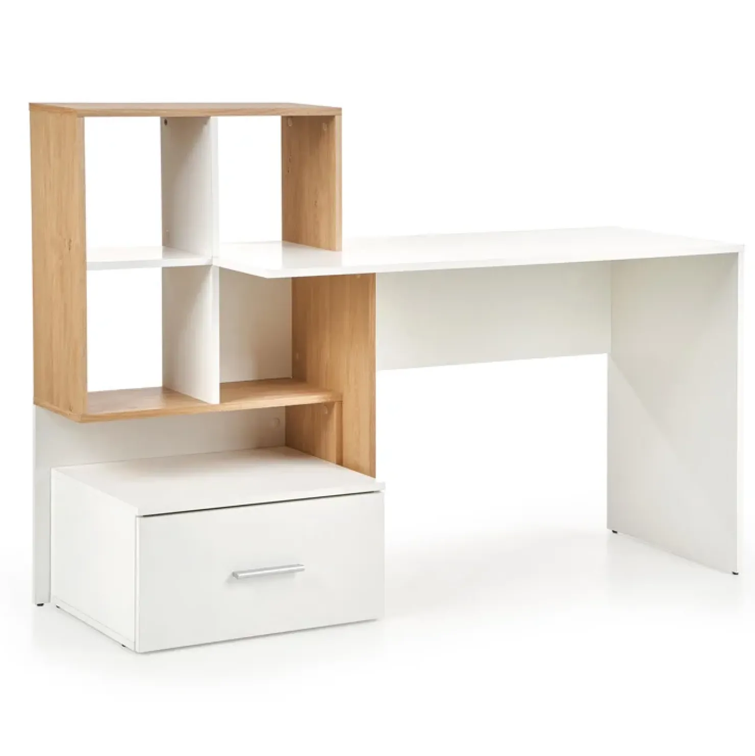 Scrivania ufficio moderna 149/50cm bianco rovere Jade Gihome®: composta da un piano bianco, 4 vani a giorno rovere ed un cassetto inferiore bianco. Ideale per apportare al vostro ufficio o alla cameretta uno stile moderno!