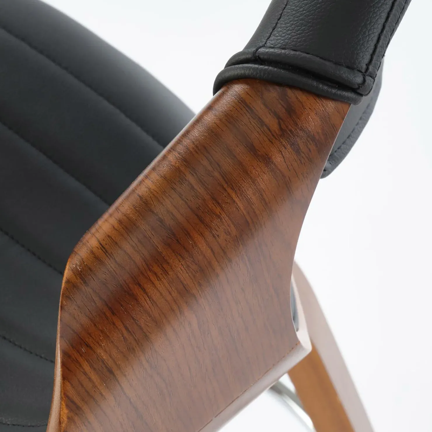 Il design sinuoso dello schienale avvolgente in ecopelle nera si fonde armoniosamente con il calore del compensato curvato color noce, creando un equilibrio perfetto tra stile e funzionalità.