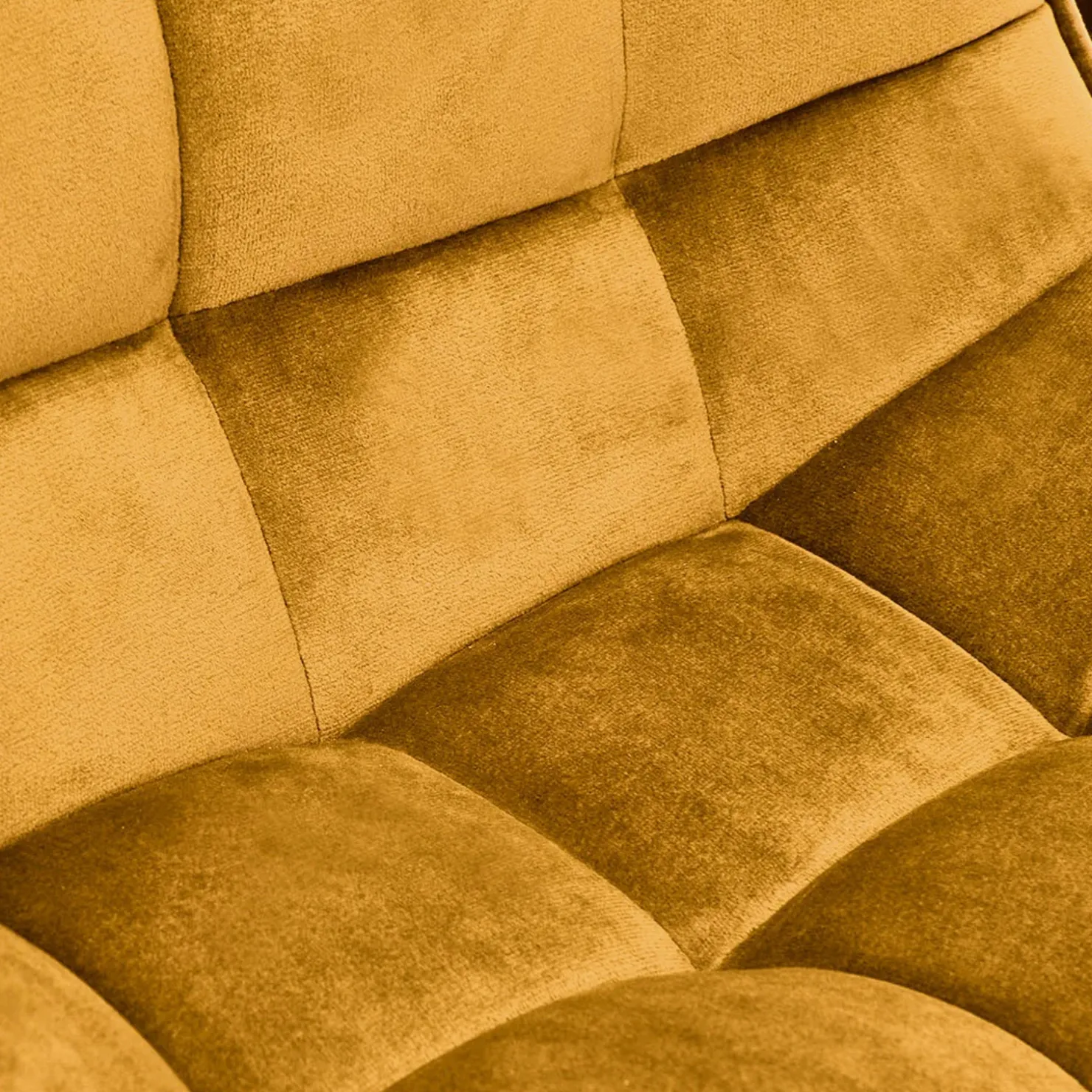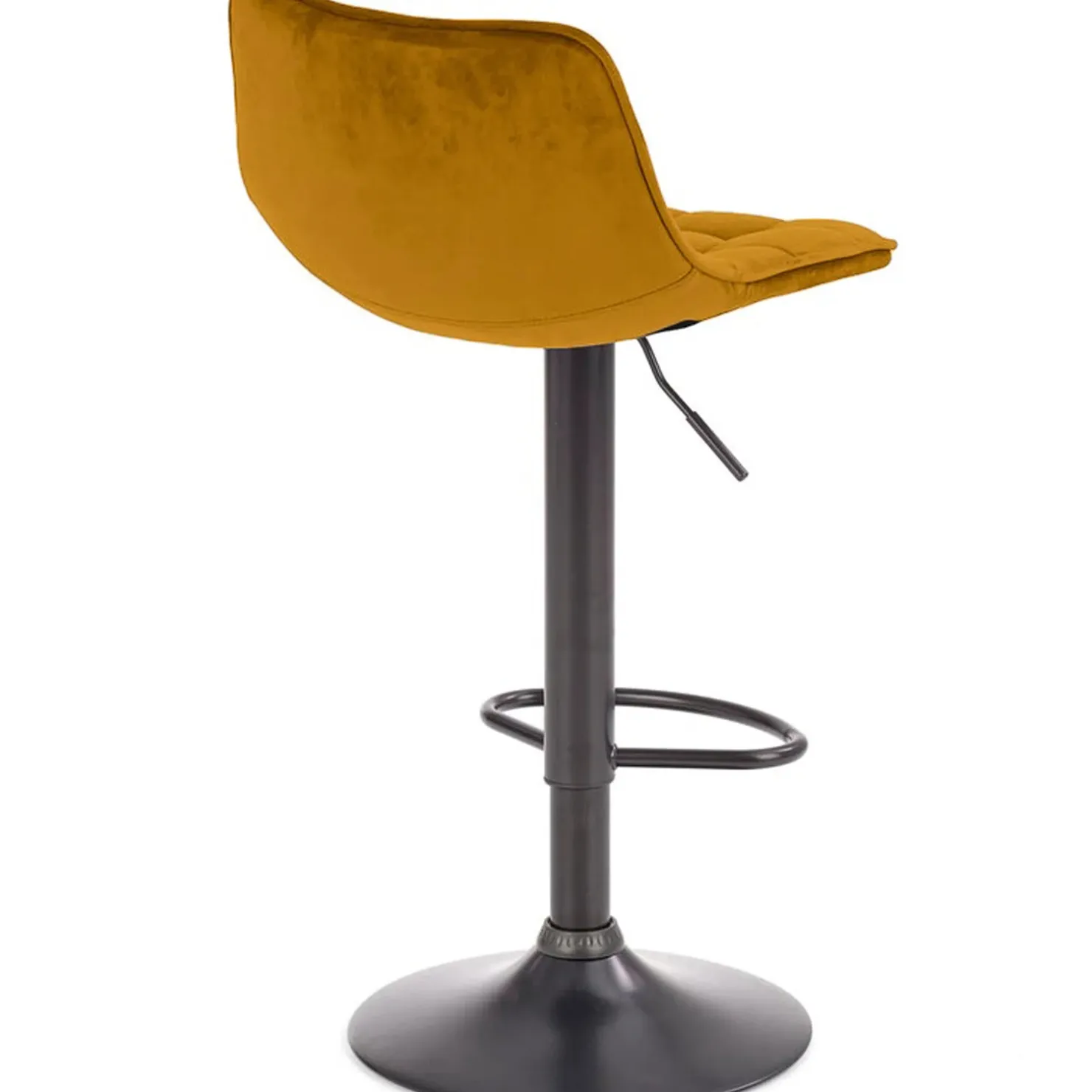 La seduta imbottita e trapuntata, rivestita in un pregiato velluto giallo senape, dona un tocco caldo e sofisticato, rendendo lo sgabello non solo bello da vedere ma anche estremamente comodo. La struttura in acciaio nero, solida e resistente, è dotata di un pratico poggiapiedi integrato per un comfort maggiore.