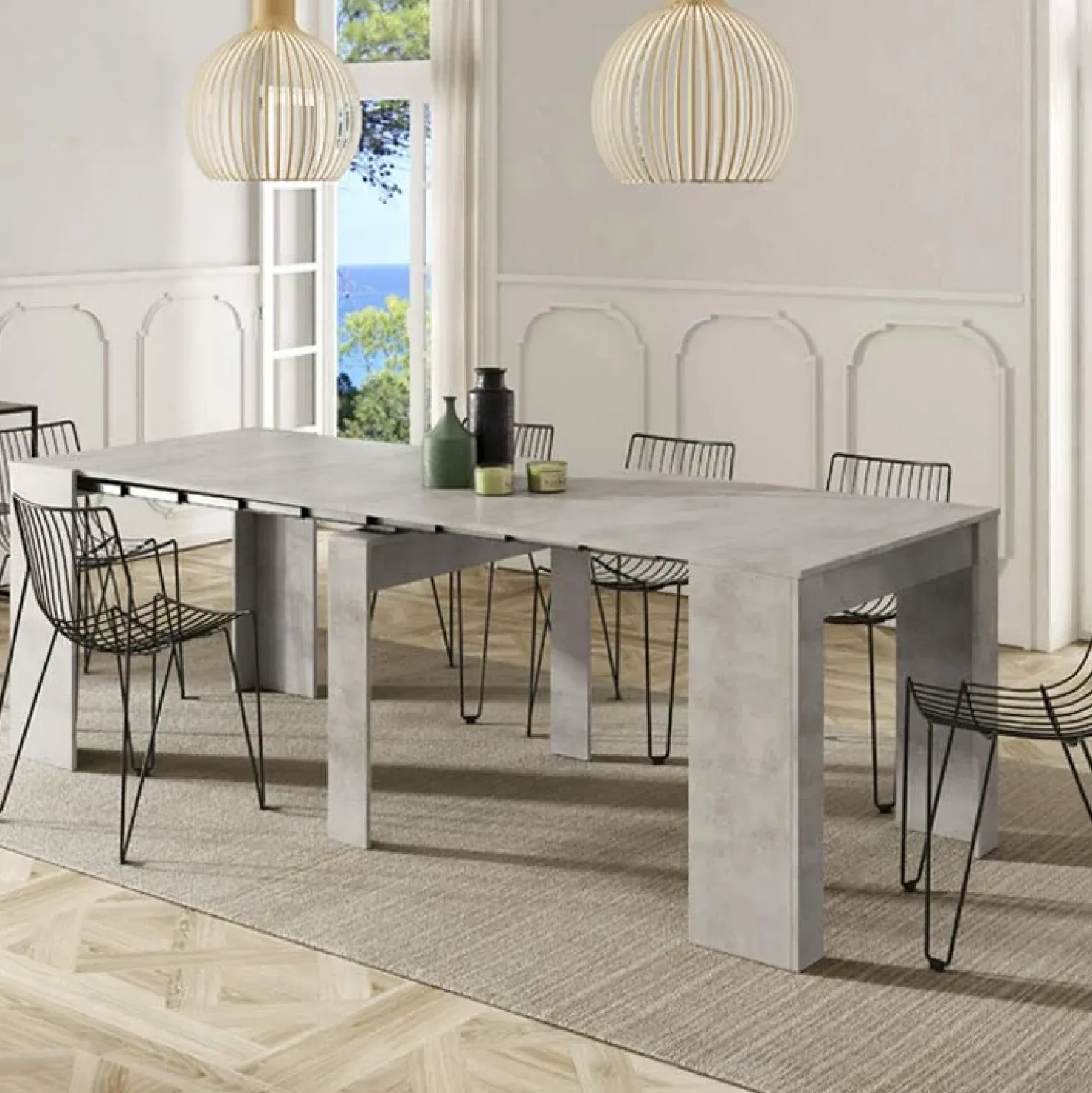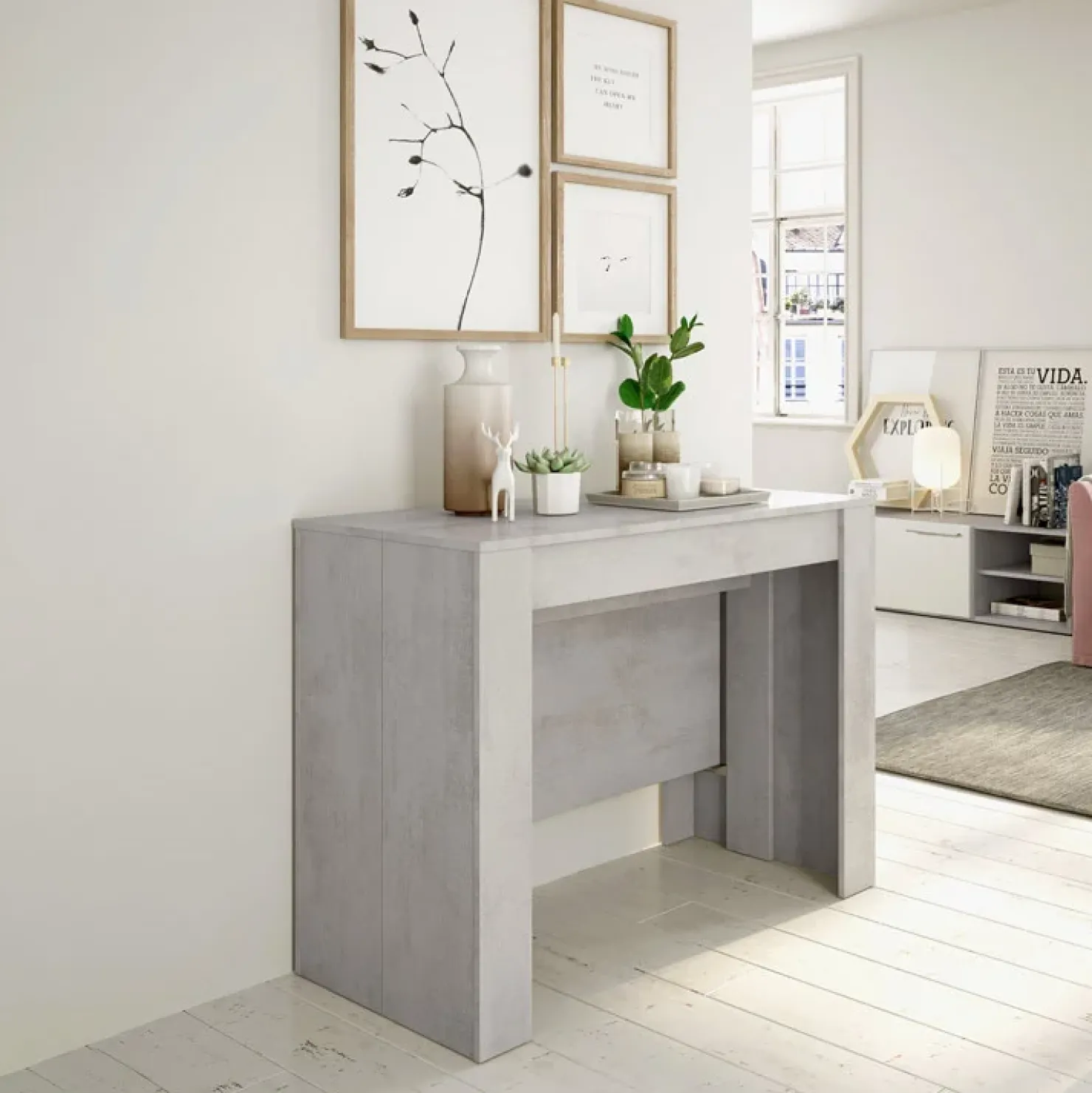 Il Tavolo consolle allungabile Fox Gihome® in finitura grigio cemento si abbina bene a pavimentazioni dalla tonalità chiare. Per rimanere in linea con la modernità del mobile, si consiglia di optare per rivestimenti all’avanguardia, come quelli in resina o in gres porcellanato. Quest’ultimo è un materiale che imita fedelmente l’effetto legno, cemento e pietra. Il legno o finto legno è senza dubbio ciò che più si addice per essere accostato a Fox Gihome®, in quanto stacca piacevolmente dalla finitura del prodotto e, al tempo stesso, conferisce ad esso e all’ambiente una nota di calore.